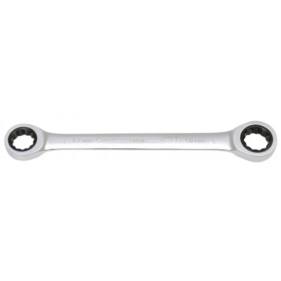 2 dimensions sur 1 clé, cliquet pour une plus grande rapidité, clé extra-plate.Tête traversante; cliquet intégré dans l’œil, angle de reprise de 5° (6° pour les 8 et 9 mm).