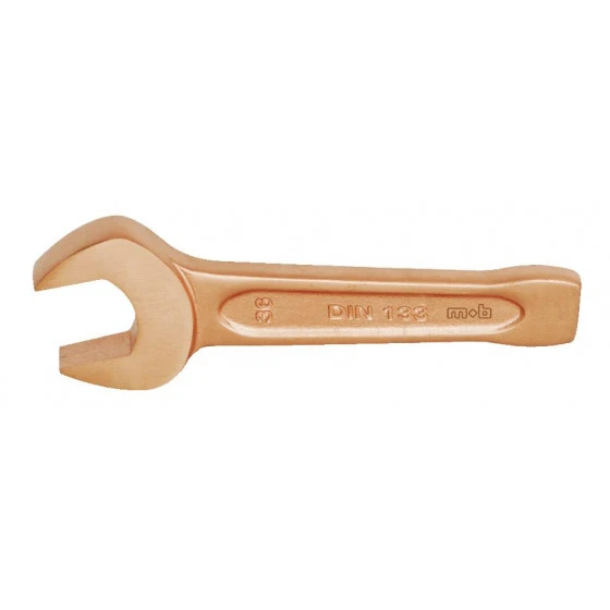 Utilisation : l’outillage Cuivre- Beryllium a pour particularité de ne pas générer d’étincelles, ce qui apporte une sécurité indispensable dans une atmosphère explosive (ATEX). En plus de cette propriété antidéflagrante, l’alliage Cuivre- Berylium est également non-magnétique et résistant à la corrosion. Réalisation : la nuance de l’alliage est Cuivre-Berylium 25, dont les propriétés de résistance sont supérieures aux autres nuances de Cuivre- Beryllium. Sa qualité est strictement contrôlée afin de garantir les propriétés anti-déflagrantes, mécaniques et de résistance à la corrosion de nos outils. L’alliage est oboitenu par coulée. La majorité de nos outils font l’objet d’une forge qui augmente la densité de l’alliage de 3% et place la qualité de notre gamme parmi les meilleures du marché. Composition : CU – Cuivre : 97.5% garanti – Be – Beryllium : 1.9% +/- .1% – Ni+Co : .2% – 1.2% – Autres : Traces inférieures à .5% garanti. Dureté : 28 – 365 Brinell. Résistance à la traction : 1 25 N/mm2. Conformes aux normes EN 1127-1 (édition 28), EN 13463-1 (édition 27) et EN 13463-5. Ces produits sont disponibles à la commande. DIN133