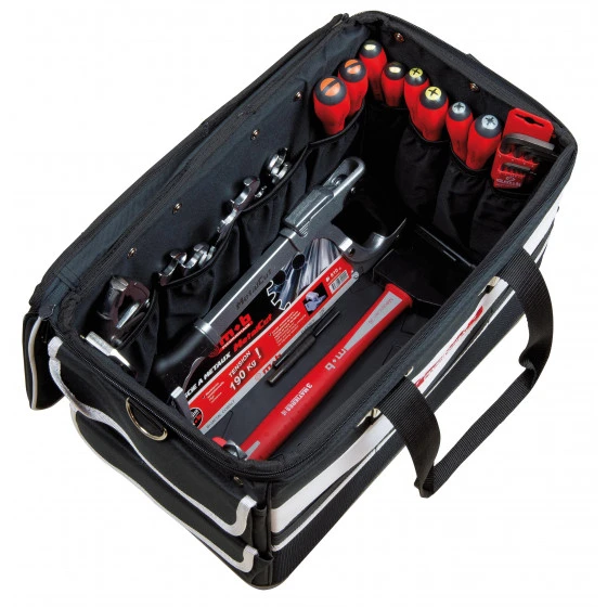 Grand volume intérieur : 37,5 L / Dimensions : L44xl25xH36 cm. Nombreuses poches de rangement : 16 intérieures et 11 extérieures. 2 “tapeholders” (boucle métal pour mesure). Forme pratique pour les articles encombrants ou volumineux. Poignée souple + bandoulière réglable. Base en polyéthylène étanche sur 4,7 cm. Toile 6 deniers, résistante à l’usure et aux accros.