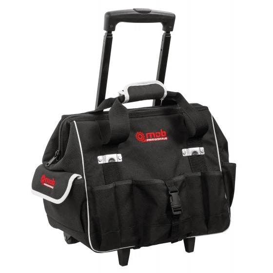 Roues robustes et extra larges Diamètre 4 mm = Stabilité améliorée. Poignée à main en relais. Ouverture à soufflet à 1 %. 15 poches intérieures et 1 poches extérieures. 2 “tapeholders” (boucle métal pour mesure). Fermeture à glissière de protection. Base synthétique dure + 4 patins élastomère. Textile à 6 derniers indéchirable. Capacité de chargement élevé : 68 kg. Volume : 44 L